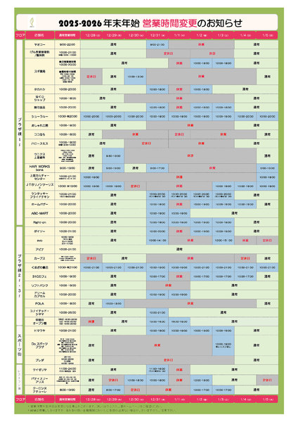 12月28日(日)から1月5日(月)までの期間を 年末年始営業とさせていただきます。 通常営業時間とは異なりますのでご了承ください。 詳しくは添付データ、 または館内ポスターをご覧下さい。