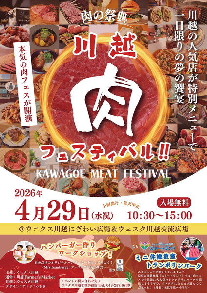 +=+=+=+=+=+=+=+=+=+=+ 川越肉フェスティバル +=+=+=+=+=+=+=+=+=+=+ 【開催日】4月29日(水・祝) 【時間】10:30~15:00 ※小雨決行・荒天中止 【場所】ウェスタ川越 交流広場/ウニクス川越 にぎわい広場 「ハンバーガー作りワークショップ」や「トランポリンパーク」も同時開催! ⇒詳しくは添付ポスターをご覧下さい。 皆様のご来場お待ちしております♬